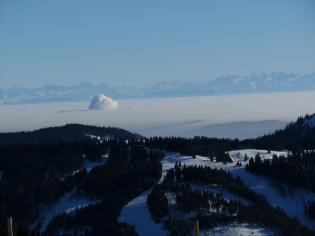 Viele Gipfel über der auf etwa 1300 m Höhe liegenden Baumgrenze, darunter ist dichter Wald (der im tief verschneiten Zustand auch seinen Reiz hat).