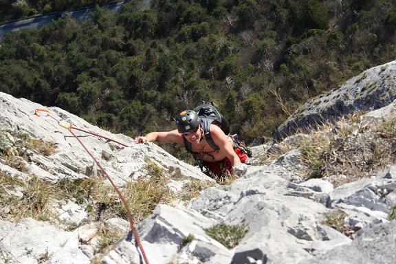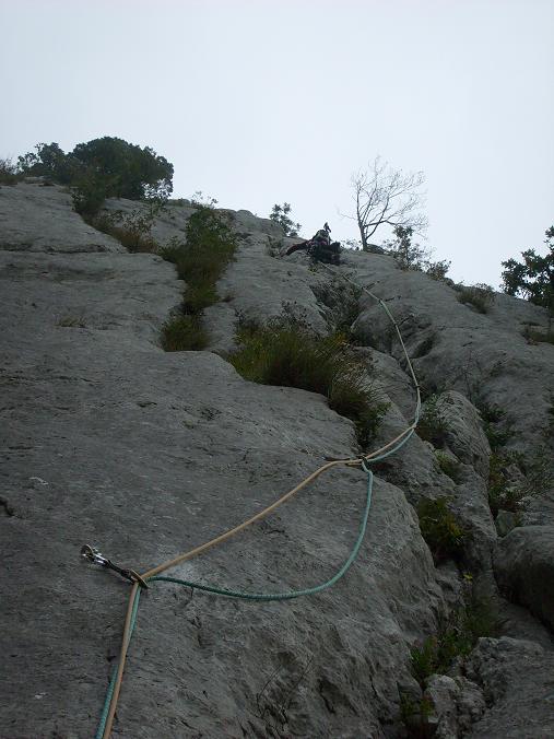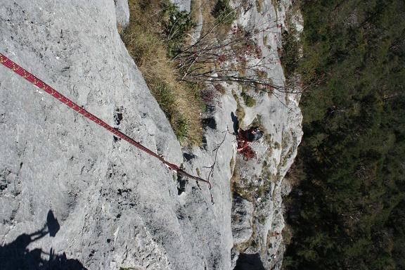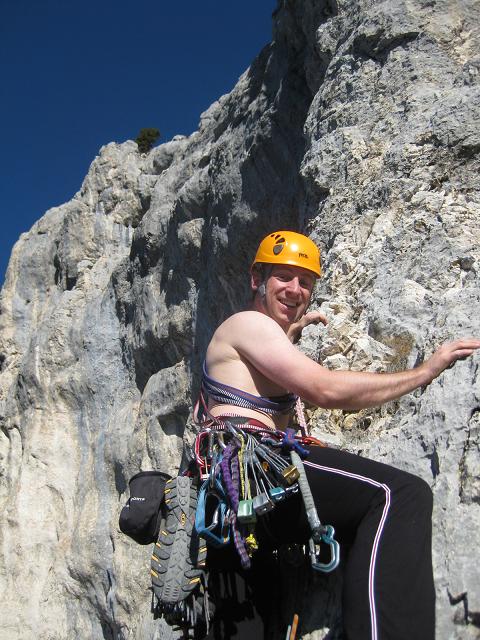 Bandschlingen, Keile und Friends können sinnvoll sein, sind aber nicht zwingend. Sollte am Ende des Tages noch Tour übrig sein, so ist ein Rückzug in sicheres Gelände unproblematisch.