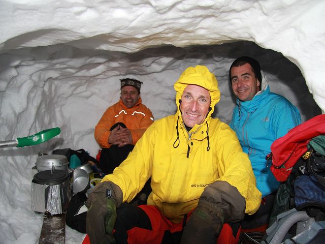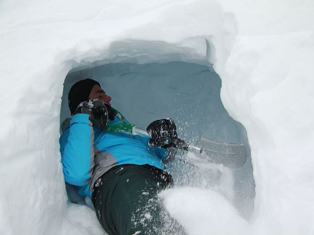Am ersten Tag beenden wir unsere Tour an einer rechtzeitig, um noch eine Schneehöhle zu graben, die ausreichend groß zum Kochen ist. In der Schneehöhle ist es i.d.R. genau 0° warm, also deutlich wärmer als in einem Zelt. Wir schlafen, abgeschottet vom Lärm der Welt, und genießen den Sonnenaufgang am nächsten Morgen.
