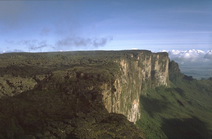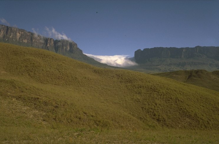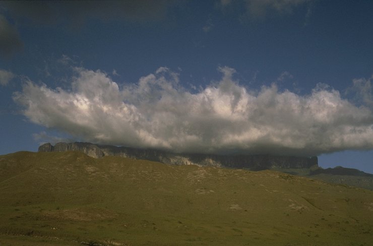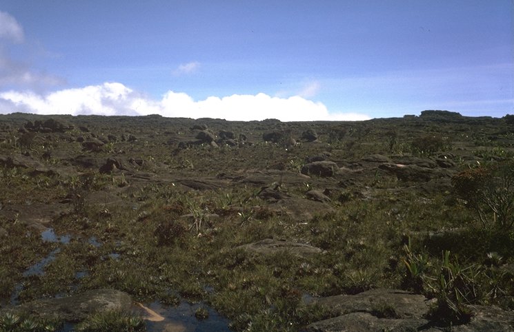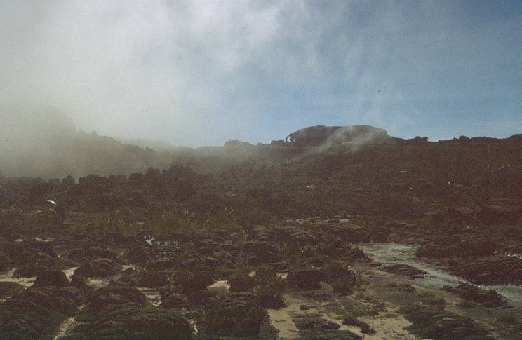 und Wanderlinx bei http://www.lampatzer.de Sa 30.12. 00 Annäherung Übers Hochplateau (Gran Sabana) geht der Weg ca. 3 Stunden überwiegend leicht bergab bis zum Lager 1 am Rio Tek. Kurz zuvor haben wir das erste Mal Sicht auf den Roraima bzw. die Wolken drumrum. Seltsam: Der Kukenan- Tepuy ist immer frei - vielleicht hat er daher ja seinen Namen, weil man ihn immer ankucken kann. ;-) 20 Minuten später quert man den u.U. reißenden Rio Kukenan. Da gibt es wieder Thunfischsalat. Während Alex und Heraldo abwaschen, sind wir bereits unterwegs. Trotzdem holen uns die beiden innerhalb einer Stunde ein. Die beiden tragen auch noch unser Essen. Unsere Zelte und Schlafsäcke tragen wir selber. Der Weg zwischen den Flüssen ist so breit ausgetreten, dass man die Wasserschuhe anlassen kann, (natürlich nur wenn man beim Gehen auf den Boden schaut.) Danach gehen wir leicht ansteigend noch etwa 2 Stunden zum Military Camp in etwa 2000 Meter Höhe. Alex und Heraldo bereiten wieder ein undefinierbares aber leckeres Hühnchengericht. Gegen 21 Uhr gehz in die Tüten. So 31.12. 00 Weg nach oben Heute ist der große Tag. Es geht zunächst wie bisher zum "Basecamp", dann sehr steil zur Rampe (Mittagessen) und dann über diese wieder einfach mit zwei Gegenabstiegen (je ca. 50 Meter, der erste zur Umgehung eines Turms, der zweite von der ersten zur zweiten Rampe) zur Ausstiegsrampe. Über diese geht der Weg zum Gipfelplateau und dort zum "Hotel", einer großen Höhle. Es war nicht einfach, noch ein freies Hotel zu finden. Ich schlafe lieber ohne Zelt in der Höhle. Endlich mal richtig Platz zum Ausbreiten. Wegen des ungemütlichen Wetters feiern wir den Anbruch des neuen Jahrtausends ;-) bereits nach deutscher Zeit - um 19 Uhr Orzzeit. Dann geht's husch, husch ins Körbchen. Mo 01.01.01 Am Roraima- Gipfelplateau Um 0 Uhr brüllt Alex ein "Happy New Year" durch die Höhle, aber kaum jemand wird wach. Bis ich mich aus meiner Tüte geschält habe, ist das Feuerwerk im 80 km (Luftlinie) entfernten Santa Elena bereits vorbei. Ich genieße stattdessen einen von jeglicher Lichtverschmutzung freien Sternenhimmel. Gegen 9 startet dann die Sightseeing- Tour. Window (Scharte zwischen Roraima und Kukenan, Felsenquellen, Gipfelblock, Wasserläufe, diverse fleischfressende Pflanzen, Regenwald von oben, mit einem Wort: faszinierend. Am Abend rächt sich dann die Völlerei der Vortage: Außer einer Tütensuppe und 1 1/2 Scheiben Pumpernickel pro Nase gibz nix. Entsprechend früh gehz in die Tüten. Di 02.01.01 Abstieg Morgens gibt es das Gleiche zu essen wie am Vorabend. Nur wird die Soppe mit ein paar. Nudeln verstärkt. Das sind natürlich keine Suppennudeln und so verkleben die Nudeln nach etwa einer Viertelstunde zu einer breiigen Masse. Nach dem ungewöhnlichen Frühstück geht's im Schweinsgalopp zum Basecamp (hier war das Mittagessen (erneut Thunfischsalat) deponiert) und weiter zum Lager 1. Bereits gegen 15 Uhr war ich hier und überlegte ernsthaft, wegen "mehr als zweifelhaft aussehenden" Wetters noch nach Paraitepuy zu laufen. Zum Glück habe ich das nicht gemacht. Es gibt im Rio Tek ein richtiges natürliches Schwimmbad, in dem man ein paar (wenn auch kleine) Runden schwimmen kann. Endlich mal wieder sauber sein ist auch für abgebrühte Outdoorerl wie mich mal ganz angenehm. Außerdem finden einen die Sandflöhe nicht mehr so gut, insbesondere wenn alle anderen bereits zur Mittagspause in einer Gumpe "gebadet" haben und erneut verschwitzt sind. Gemeinsam mit Ray's Gruppe wird gekocht und der Abschluss gefeiert. Die Träger und Führer, die den Alkohol nicht so sehr gewohnt sind, sind schon nach zwei Dosen Bier (je 225 ml) richtig "fröhlich". Selbst Heraldo, der auf dem ganzen Weg kaum ein Wort gesprochen hat, ist plötzlich gesprächig. Es werden neue deutsch- brasilianische Freundschaften geschlossen, die beiden Hauptbeteiligten unterhalten dann die anderen etwa 40 Leute im Lager bis in den frühen Morgen;-(. Ich selber habe Ray versprochen, hier etwas für ihn zu werben. Ray betreibt eine Indianervermittlung, bei der man neben "vorgefertigten" Touren sich auch einen Begleiter für Touren auf eigene Faust mieten kann. Weil viele der Indianer aus Guayana kommen, sprechen sie (im Gegensatz zu den aus dem Norden eingewanderten Venezolanern) zum größten Teil englisch. Ray ist einer der Wenigen, die auch den Auyan Tepuy, von dem der höchste Wasserfall der Welt hinabstürzt, im Angebot hat. Das Vergnügen ist allerdings nur per Buschflieger zu erreichen, dauert 9 Tage und kostet bei 4 Personen rund 1000 Mark (alles inbegriffen) pro Nase. Dafür ist man dann zwei Tage am Gipfelplateau des flächenmäßig größten Tepuys. Die Tour startet in Cuidad Bolivar und dauert daduch auch nicht länger als die (in Sta. Elena startende) Tour auf den Roraima. Ray ist nicht nur seit 12 Jahren erfahren, sondern auch ein unheimlich netter Kerl. Wer ihn kontaktieren will, klickt auf seine Visitenkarte: Mi 03.01.01 Weg nach Paraitepui Reichlich unausgeschlafen tröpfeln wir zwischen 8 und 9 Richtung Paraitepuy los, wo wir zwei Gruppen(19 Teilnehmer), zwei Führer und vier Träger 3-4 Stunden später ankamen. Wir schnappen die nächsten Jeeps und fahren zum Baden. Der zweite Wasserfall fällt trotz Ankündigung aus: Es wird so schon knapp genug mit der Zeit. Tipps & Links stehen