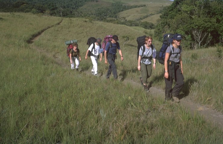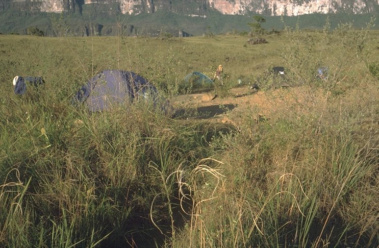 die Rettung. Schon der Biss von einer der dort lebenden Riesenameisen (5mal so groß wie die unseren...) ist unangenehm genug, um einem einen ganzen Urlaubstag gründlich zu verderben. U. a. deshalb sind Hängematten dort so beliebt: damit ist man vom Boden weg - und sicher vor dem allermeisten Ungeziefer. Es ist unter allen Umständen zu vermeiden, dass man beim Gehen mit der bloßen Haut das Gras abstreift. Sobald der Boden bewachsen ist braucht man knöchelbedeckende Schuhe, wer sich die Hosenbeine hochwickelt, muss sie wieder runterwickeln, sobald Gras in den Weg hineinragt. Wer allein im Zelt schläft kann die Schuhe ins Zelt nehmen, die anderen sollten, sofern sie nicht auf fremden Schuhgeruch stehen, dafür sorgen, dass sie morgens beim Anziehen der Schuhe nicht auf unerwünschte Untermieter stoßen. Ich habe die Schuhe auf meine in den Boden gerammten Wanderstöcke gestülpt. Kurze Tour: Der Chirikeyen- Tepui ist als 2- Tages- Tour zu machen: