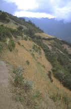 jedoch großartig. Zu allem Überfluss eröffnet mir ein Ranger, dass meine Permission abgelaufen ist und ich zwecks ihrer Verlängerung mich ins Tal begeben müsste. Widerwillig fahre ich mit der Seilbahn runter. Unten finde ich sofort eine deutschsprachige (!) Posada direkt an der Seilbahn- Talstation - besser kann es gar nicht laufen. Di 09.01. Merida Ich schlafe fast 12 Stunden und wache wie gerädert auf. Sachen in die Wäscherei schaffen, einkaufen, organisierte Touren und Fahrpläne in Erfahrung bringen, (umständlich) "Landkarten" und Bustickets besorgen, etwas Sightseeing und der Tag ist fast gelaufen. In Merida stehen für die, die es gar nicht lassen können, an allen Ecken etwa 12 Meter hohe (künstliche) Kletterwände herum. z.B. Av. 8/Ca. 24. Die an der Seilbahn- Talstation ist nachts beleuchtet. Dort kann man für 1000 Bs (ca. 3,30 DM) ein Mal gesichert hochsteigen. Der Sicherungsmann lässt einen, sofern man nicht zu schwer ist, ein gutes Stück herunterfallen, bis er einen kurz vor dem Boden mehr oder weniger sanft abbremst. Die Wand ist mit riesigen Griffen und Tritten ausgestattet, dass auch jeder hochkommt. Ich mache das auch mal mit und komme mit dem Sicherungsmann ins Gespräch. Er stellt sich als "Lenin Marx" vor und zeigt zum "Beweis" einen mit Sicherheit getürkten Studentenausweis vor. Aber möglicherweise stimmt der Vorname; immerhin lässt sich auf einer der unten aufgeführten Kletterseiten ein gewisser Lenin Zerpa finden. Er ist Angehöriger der Nationalmannschaft und verdient sich mit dem Touristenvergnügen seinen Lebensunterhalt. Sponsoren gibt es kaum, der Sport ist Trainingszeit aufwändig und das Material ist 2-3 Mal so teuer wie in .de - und das wo die Leute nur ein Drittel von dem verdienen wie in .de. Wir vereinbaren für Freitag ein Treffen. Die Schlussabsprache soll erst morgen sein. Er muss noch Material besorgen und will außerdem noch etwas Bedenkzeit. Mi 10.01. Vielleicht die schönste Wanderung der Gegend Mit dem Kleinbus (Por Puesto) geht es umständlich zum Laguna Mucobaji (~3500 m) Porpuesto nach Tabay, Porpuesto nac Los Apartaderos, Taxi (gleiches Fahrzeug) ans Ziel. Dort kann man den Pico Mucu~nuque (4672 m) erwandern. Man sollte ein Paar Grödel mitnehmen, der Schnee in den bis etwa 16 Uhr beschatteten Rinnen ist bockelhart. Die Teile deponiere ich dann auf einem Stein- Am Rückweg sind sie weg. Das können nur die sechs Eingeborenen gewesen sein, die in Stoffturnschuhen (!) oben waren und den Abstieg fürchteten. Aufgrund der Nachmittagssonne lassen sich die Schneerinnen jetzt auch ohne Grödel gehen. Aber der Genuss ging mir verloren - schließlich brauche ich die Teile u.U. noch später und ich laufe wie ein Kaputter den Berg hinunter. Der Weg ist aus einer Sicht bemerkenswert: Er verläuft über 7-8 Ebenen, zwischen denen jeweils eine steile Stufe ist. Jede dieser Ebenen hat iher eigene Vegetation. Hier wurden trotz der Eile eine ganze Menge Fotos gemacht. Unten kriege ich die sechs Diebe noch. Sie bedanken sich artig, dass ich ihnen die "Steigeisen" überlassen habe und reiten von dannen. Ich genieße die letzte Abendsonne und weiß nicht, dass 2000 Meter tiefer in Merida ein Unwetter herrscht, das die Stadt schier unter Wasser setzt. Damit verpasste ich die Absprache mit Lenin, zumal ich erst um 20 Uhr 30 wieder in der Posada war. Lenin glaubte wohl ich hätte das Interesse verloren. Wegen Sprachproblemen gab er auch keine Telefonnummer an. Und wegen Regens hat er die Kletterwand bereits am Nachmittag wieder verlassen. Do 11.01. Durchs Gemüse Der Plan für heute sieht vor, nach Mucuruba (2900 m) zu fahren und über der Pan de Azucar (ca. 4200 m) in der Cordillera del Norte (von Merida aus gesehen) zu einem Dorf auf etwa 3300 Meter zu gehen. Doch das scheitert kläglich. Zuerst finde ich den Weg nicht. Er beginnt erst auf einem Hügel ca. 600 Meter über Mucuruba. Markierungen sind natürlich Fehlanzeige und so schlage ich mich erst mal eine Stunde durch die Büsche. Der Weg, sofern er nicht überwuchert ist, führt durch einen unheimlich steilen Wald bis zu einigen Seitentälern des Flusses, den er begleitet. Der Fluss selber verläuft in einem engen Tal, in dem nicht einmal ein solcher Weg Platz hat. Nachdem ich - soweit man das auf _so_ einer Karte überhaupt beurteilen kann - etwa ein Viertel des Weges geschafft, aber bereits die Hälfte des Tages verbraucht hatte und ich mittlerweile blutige Beine von dem den Weg überwuchernden Gestrüpp hatte, gab ich auf. Das nächste Mal nehme ich mir zwei Tage Zeit und eine Machete mit. Der Weg selbst ist landschaftlich reizvoll, aber nicht spektakulär parallel zu einem Hang, viele Hundert Meter tiefer rauscht der Fluss, dass man es bis hoch hört. Bilder gibt es daher keine, mit Ausnahme der Aussicht vom Hügel oberhalb des Dorfes. Fr 12.01. Verpasste Gelegenheiten. Heute wollte ich eigentlich mit L. klettern gehen. Aber die endgültige Verabredung ist bekanntlich geplatzt. Den Vormittag habe ich halb mit Sightseeing verbummelt, den Nachmittag mit zwei Kanadiern geklettert. Abends traf ich dann L. wieder an der Kletterwand und konnte wenigstens diese Bilder schießen. Leider sieht man auf diesen nicht die Eleganz seiner Bewegungen. Es hätte neben dem allgemeinen Klettervergnügen noch vier weitere Vorteile gehabt. 1. hätte er mir viel beibringen